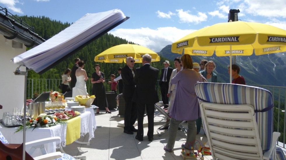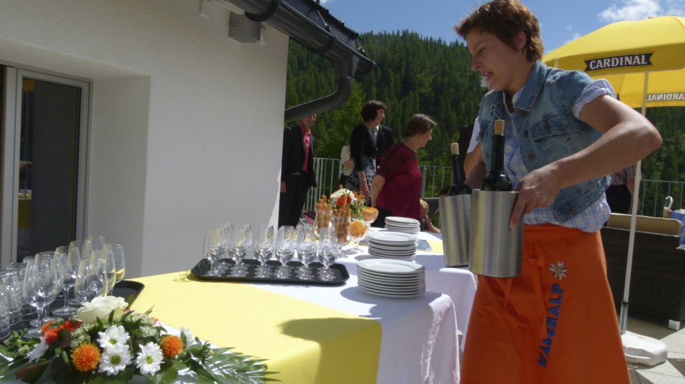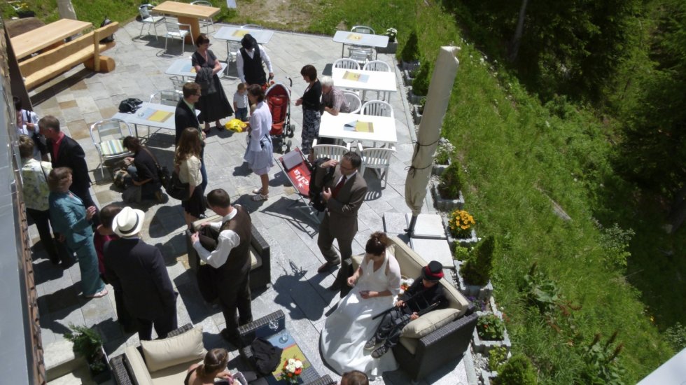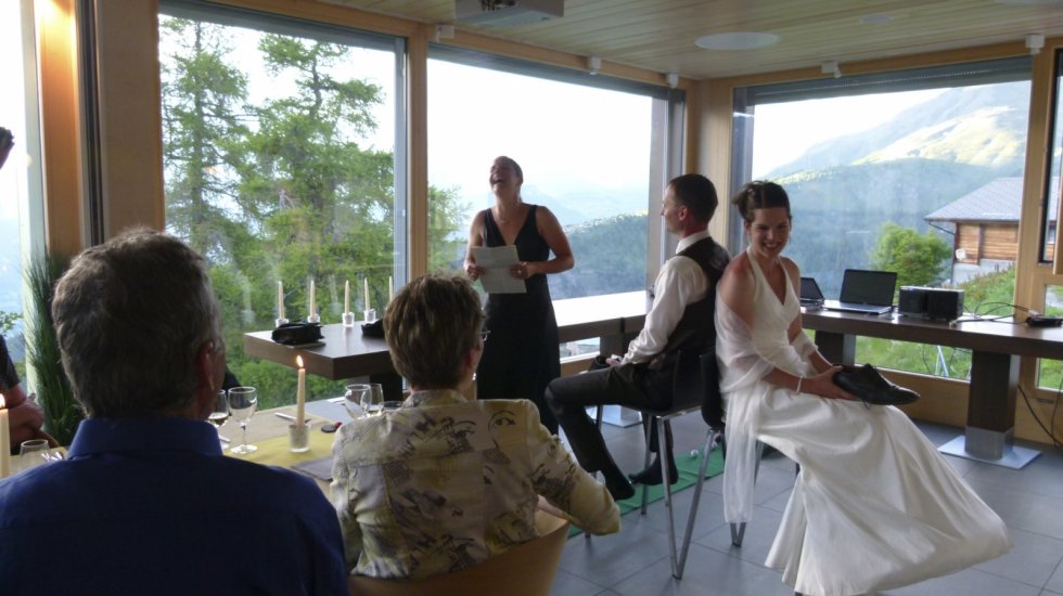 Bei uns auf der Wasenalp, oberhalb Brig im Berggasthaus Wasenalp, kann man den schönsten Tag im Leben auf natürliche, unkomplizierte Art und Weise feiern, fern von Hektik und Paparazzi. Apero mit Musik auf der grossen Dachterrasse, gediegenes Abendessen im Kubus mit einmaliger Aussicht, Fotoshow mit der Beameranlage, vielleicht sogar eine gemeinsame Kurzwanderung mit Picnic.