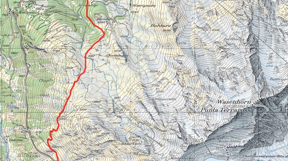 Dann steigt man abwärts zur Talstation des oberen Skilifts des Skigebiets Rothwald / Wasenalp. Weiter auf dem Weg zur Bärenfalle Richtung Osten. Von hier steigt man hinunter zum Weg, der durch das Doruwaldjy direkt zum Berggasthaus Wasenalp führt.