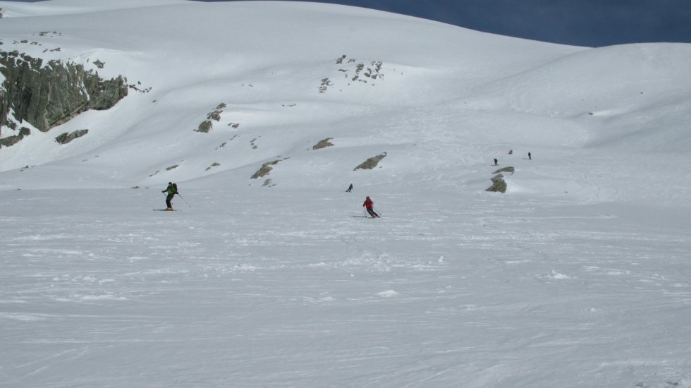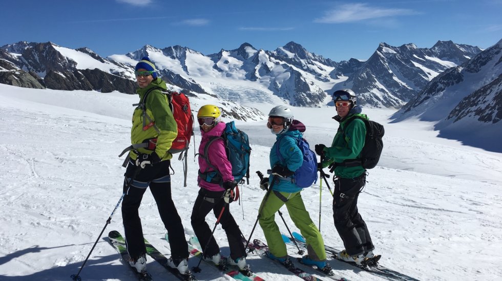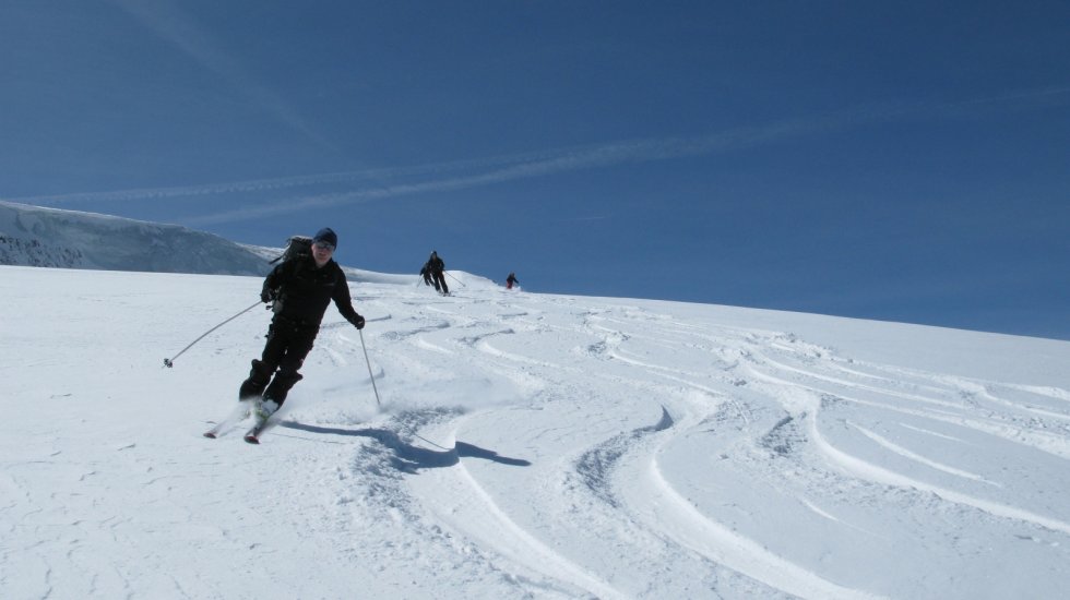 Nach einem kurzen Briefing starten wir mit dem Helikopter und fliegen zum Landeplatz der Ebnefluh 3811m. Vorbei am majestätischen Bietschhorn sind wir innert wenigen Minuten mitten in einer grandiosen Gletscherwelt. Die Abfahrt über die langen Hänge zur Lötschenlücke sind genau richtig um sich an den Tiefschnee anzugewöhnen. nach der Lötschenlücke fahren wir die Hänge hinunter bis zum Ende des Langgletscher wo wir uns wieder vom Helikopter abholen lassen.