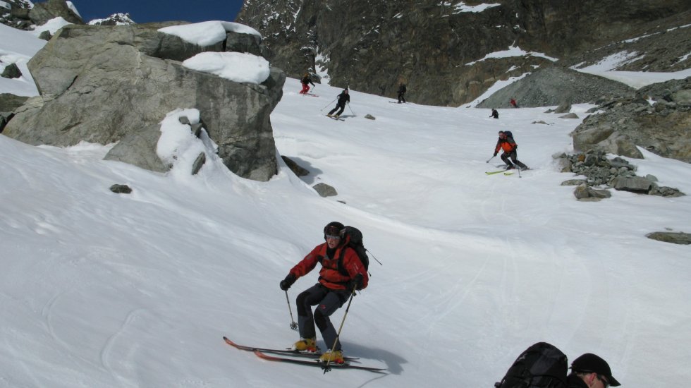 Zuerst eine lange Gletscherabfahrt von der Ebnifluh und dann eine rassige Abfahrt vom Petersgrat nach Blatten ins Lötschental.