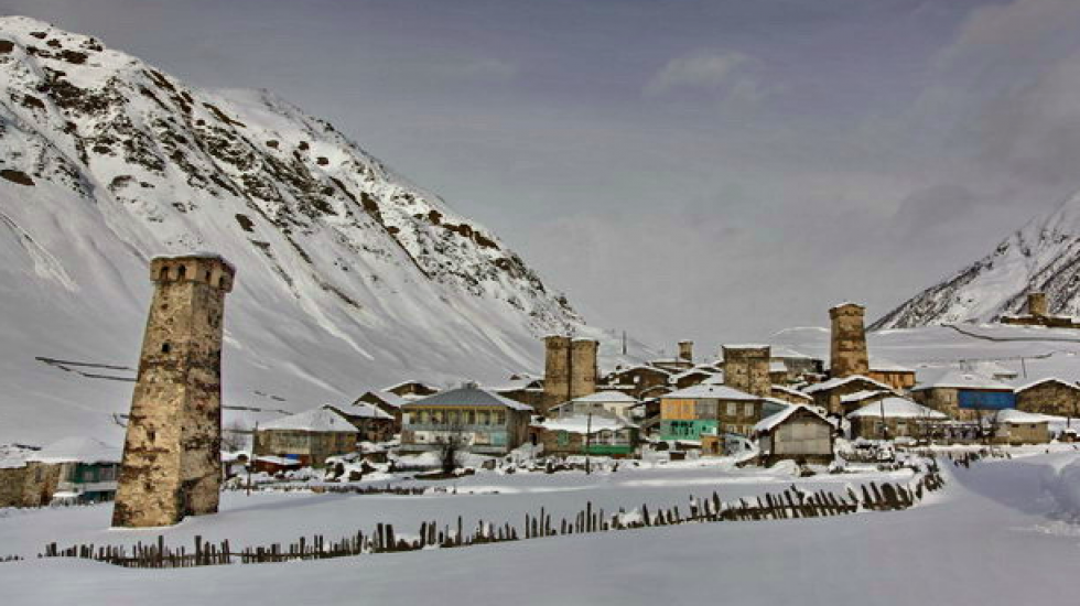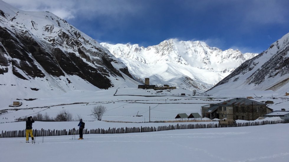 Dieses Dorf am Ende der Enguri Schlucht ist ein Teil des UNESCO Weltnaturerbe. Dank der Höhenlage bietet das Gebiet unzählige Skitouren.