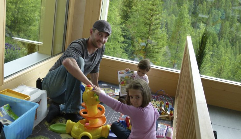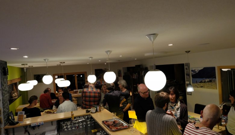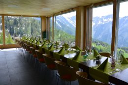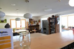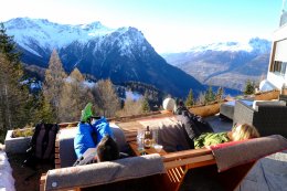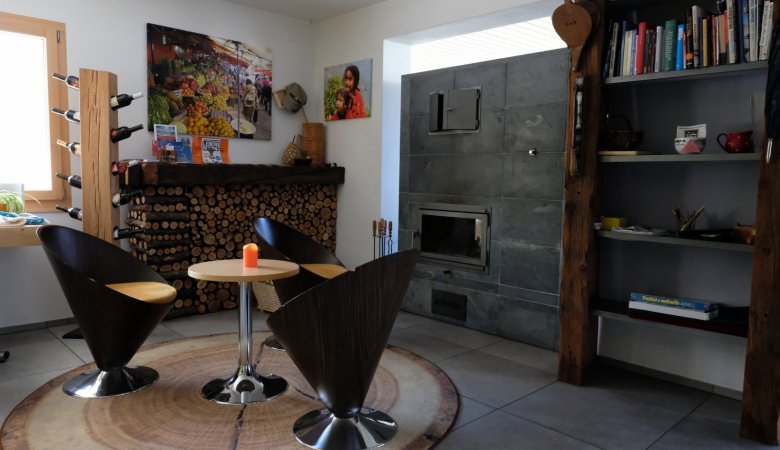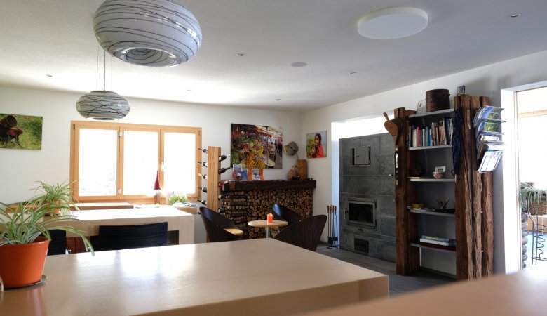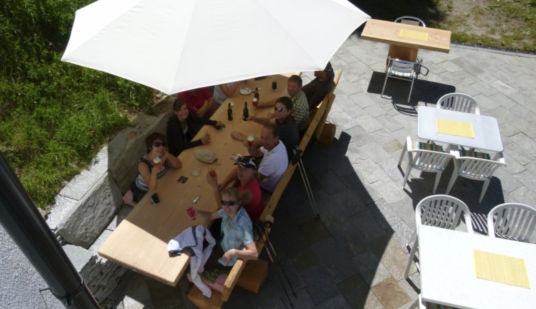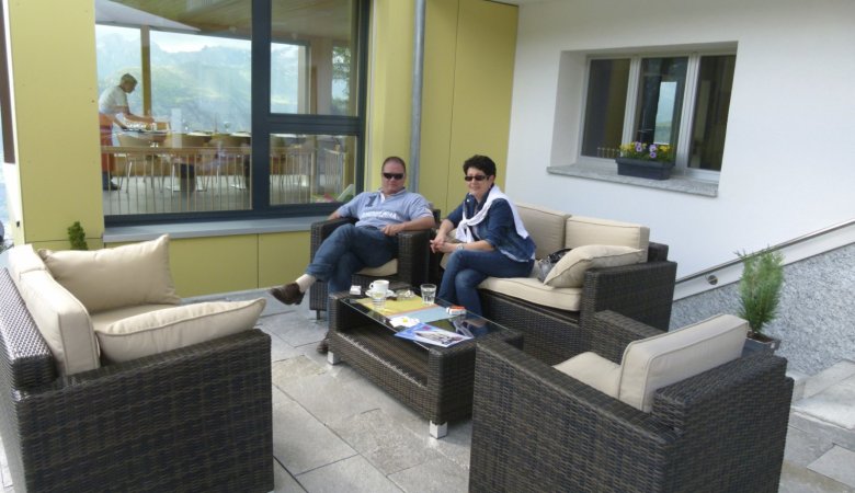 Die sonnige Terrasse im Eingangsbereich hat für jeden etwas. Die Launch für gemütlich ein Aperöli zu nehmen, der grosse Holztisch, wo deine Gruppe bis zu 14 Personen zusammensitzen können, einer der vielen Tische, um eppis z'trichu oder z'ässu oder der Doppelliegestuhl, um die Beine hochzulagern.