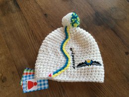 Die trendige Mütze ist "handmade gestrickt" und mit dem Wasenalp Lo...